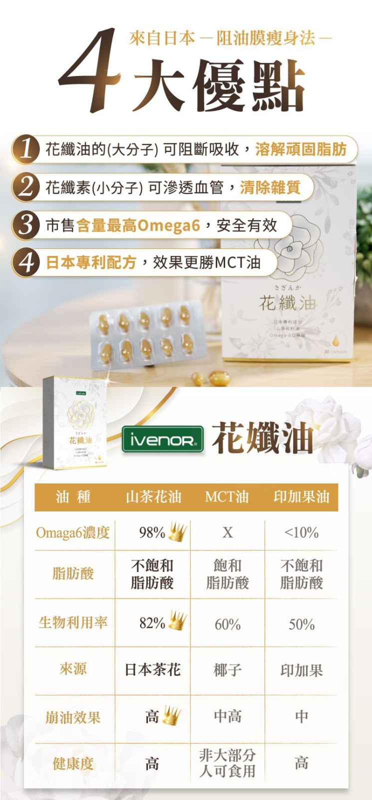 日本吹起山茶花油瘦身風,余祥銓代言推薦IVENOR山茶花油軟膠囊花纖油,吞油阻油!讓肥天鵝也能重見曙光,重新換上S號曲線。 這種吞山茶花油減重的不節食,不傷身,不反彈的減肥方法,不久前也在日本大為風行,郭婷筠也搭配日本流行的山茶花油後,沒想到讓她也成功瘦了下來,身形小了兩號,重新找回了健康。